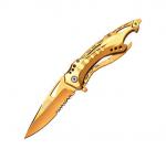 Spring assist folding knife offers rapid one-handed deployment, locks securely into place with liner lock Stainless steel half-serrated blade with gold titanium coating Gold titanium-coated aluminum...