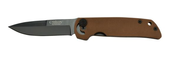 Camillus Cuda Mini pocket knife features a 3" drop point AUS‑8 blade treated with carbonitride titanium for superior corrosion resistance and a matte black finish. Flat grind geometry and a smooth edge deliver precise cutting performance. Ambidextrous Coyote Brown G10 handle, liner lock mechanism, and pocket clip ensure secure, comfortable carry.