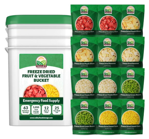 Our Freeze-Dried Fruit & Vegetable Bucket contains 6 pouches of freeze-dried fruit and 6 bags of freeze-dried vegetables, featuring our most popular produce. These fruits and vegetables were picked at peak freshness and freeze-dried to preserve the integrity of the produce and the nutrients found within it.