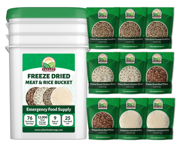 Valley Food Storage's meat and rice bucket is the perfect food storage solution for all your protein and caloric needs. Containing all of the most critical and hard-to-find proteins and densely packed high-quality rice to supplement additional calories our Meat & Rice bucket will become a staple in your food storage.