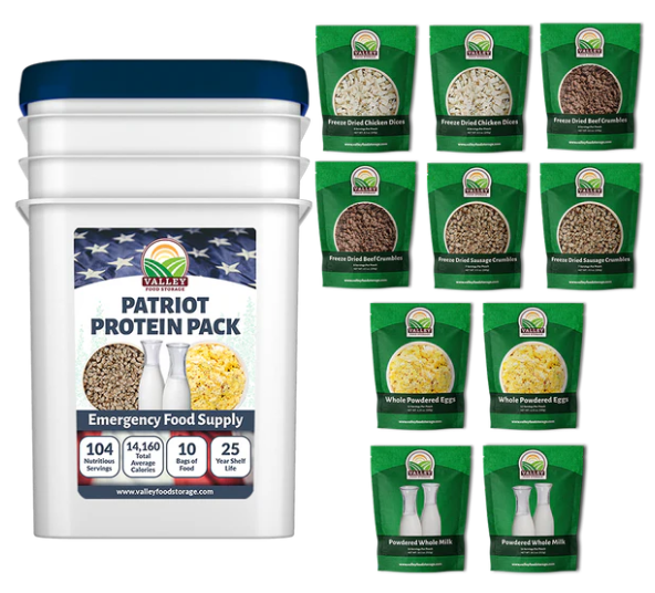 Introducing the Patriot Protein Pack from Valley Food Storage. Packed with 104 servings, 1,800 grams of protein, and 12,720 total calories, this bundle includes sausage crumbles, chicken dices, beef dices, powdered whole eggs, and fortified milk, ensuring you have the essential nutrients to stay nourished and resilient during any situation. Elevate your preparedness with this power-packed protein solution.