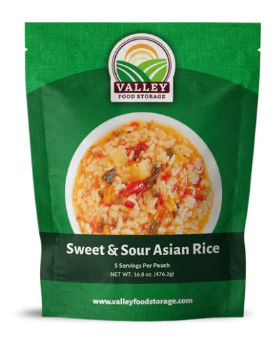 Valley Food StorageSweet and Sour Rice features red and green peppers with a touch of pineapples making it perfect for a quick and convenient lunch or dinner for the whole family. Each pouch of sweet and sour asian rice contains 5 servings