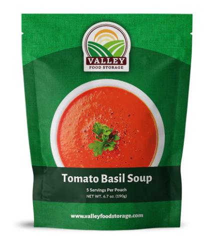 Valley Food Storage Tomato Basil Soup features a rich and creamy homemade flavor that will remind you of your childhood making it perfect for a quick and convenient lunch or dinner for the whole family. Each pouch of tomato basil soup contains 5 servings.