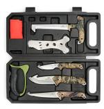 8 PIECE BIG GAME FIELD DRESSING KIT in BOX: 8-3/4" Wood/Bone Saw, Steel Stick/Brisket Spreader, 7-1/2" Caping Knife, 9-1/2" Gut Hook Skinner, 10" Boning Knife, Tungsten Carbide V-...
