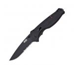 Spring assist folding knife offers rapid one-handed deployment, locks securely into place with liner lock Black half-serrated stainless steel blade...