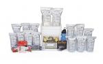 The kit includes the following: Food and Water: 5 Boxes of Aqua Literz - Equivalent to 30 packets of emergency water (5 Liters) and each box has a 5 year shelf-life5 - 2400 Calorie Food Bars (12,000...