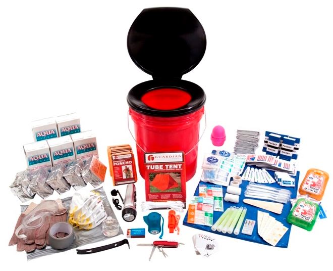 Product Description SKU: OKFP Weight: 35.00 LBS (All items are packed securely in our 5 Gallon Bucket with Toilet Seat Lid) The kit includes the following: Food and Water: 5 Boxes of Aqua Literz - Equivalent to 30 packets of emergency water (5 Liters) and each box has a 5 year shelf-life 5 - 2400 Calorie Food Bars (12,000 Calories) - 30 Individually wrapped bars with a 5-year shelf life 50 Water Purification Tablets - each tablet purifies 1 liter of water Light and Communication: Dynamo Radio Flashlight 4 in 1 - AmFm Radio, Siren, 3 LED Flashlight, Cell-phone Charger with adapter included (NEVER NEEDS BATTERIES) Rechargeable Squeeze Flashlight - 3 LED flashlight which generates and stores power by squeezing the handle (NEVER NEEDS BATTERIES) 30 Hour Emergency Candle - can also be used as a stove 5 - Green Emergency Glow Sticks - lasts for 12 hours 5-in-1 Survival Whistle - loud shrill whistle (travels over 1 mile) containing a flint starter, signal mirror, compass, and lanyard Box of 50 Waterproof Matches Shelter and Warmth: 5 Emergency Survival Blankets - Retain over 90% of the users body heat 2 Person Tube Tent with Rope 5 Emergency Ponchos with Hood Tools: 6´ x 8´ Blue Tarp 7-1/2" Flat Pry Bar 16 Function Knife Leather Palm Work Gloves Duct Tape - 2" x 10 yards 5 - N95 Respirator Dust Masks -NIOSH approved Safety Googles Sewing Kit Hygiene and Sanitation: Toilet Bags with Chemicals -Sealable, leak proof outer bag sealed to inner waste bag containing Bio-Gel waste gelation 5 Hygiene Kits- toothbrush, toothpaste, bar of soap, and 9 wet wipes 5 Tempo Pocket Tissue Packs Air Freshener First Aid: 2 - 57 Piece Deluxe First AId Other: Deck of playing cards for entertainment Emergency Survival Kit Information: This survival kit was designed using advice from experts in the emergency preparedness industry. It follows guidelines given by government agencies and non-profit preparedness organizations. This 5-person deluxe office emergency kit has a retail value of $195. Write your own product review Product Reviews Came in handy during Hurricane Sandy Posted by Heather M. on 3rd Dec 2012 We had no power for a few days and there were trees down everywhere. We decided to stay at home and used a lot of the supplies in this kit. Glad we had it. Now I have to restock. BEST BIRTHDAY GIFT FOR A 50TH Posted by Jeffrey G. Avella on 24th Apr 2012 I Purchased this Family Survival Kit for a Family member the occasion was a 50th Birthday.The kit was shipped promptly and its contents are not only thought out and useful but also Valuable in a emergency.This gift was received with a heartfelt thank you knowing its purpose,there was also many in the room who saw the value and want to purchase for their family. Well Done! Family is happy now Posted by Elana on 22nd Sep 2011 We got our kit and had a talk about preparedness. Have to say we all feel better. I love the way this kit is put together. Has just about everything I need. Now I can fill in with some personal items. Nice Posted by Chappy on 25th Apr 2011 My kit arrived the other day very qiuckly and I have to say I was quite impressed with how well it was put together. I hope I never have to use it. Just what I needed Posted by Nichole on 17th May 2010 Fully functional kit in a 5 gallon bucket. Absolutely took the guess work out of putting something together to protect my family in case of an emergency. Where we live there are so many possible emergencies/bad situations and with a family of 4 I wanted to be prepared. We simply added a few items personal to us and we are set. Thanks for the detail in preparing this kit Perfect kit for my family Posted by Unknown on 11th Mar 2010 This kit has everything I need for my family. I like that it comes in a bucket so they contents are protected. I felt it had all the items I may need to deal with the widest range of possible situations.
