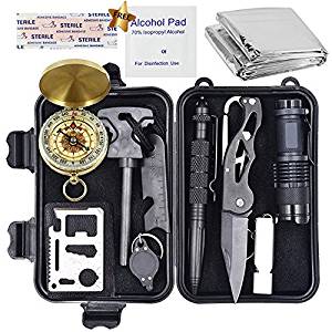 Emergency Survival Kit 11 in 1, Outdoor Survival Gear Tool with Folding Knife, Compass, Emergency Blanket, Fire Starter, Flashlight, Whistle, Tactical Pen etc for Camping, Hiking, Climbing, Trips