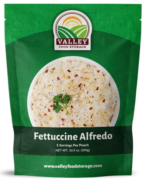Valley Food Storage Fettuccine Alfredo features a thick, creamy white sauce with egg noodles that will give you that “old-world Italian feeling" making it perfect for a quick and convenient lunch or dinner for the whole family. Each pouch of fettuccine alfredo contains 5 servings.