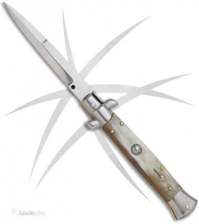 This classic Italian stiletto has real honey horn scales and a stainless bayonet blade. This knife has fast action and lock-up from the push button, and protection against accidental release with the sliding safety. Polished bolsters and hardware make this a beautiful addition to your Italian collection.