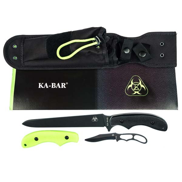 KABAR ZOMBIE DEATH DAGGER WITH DELUXE SHEATH This highest quality steel knife with 8.5 blade comes mounted with toxic green handles. Extra set of black scales and Acheron skeleton knife included. Poly lined deluxe sheath holds dagger Skeleton kni