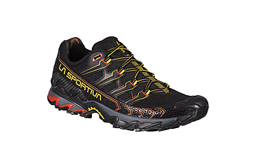 Product Info for La Sportiva Ultra Raptor II Running Shoes - Men's Aesthetic re-edit of the famous Ultra Raptor model, trail running shoe developed for long-distance off-road routes and prolonged training sessions. The upper is in highly breathable air-mesh fabric and is assembled by integrating a shock-absorbing Endurance Platform in soft EVA with differentiated thickness (greater at the toe, lower at the heel) for excellent impact absorption in any situation and reduction of the ramp -angle. The rear stabilizing heel allows perfect control on traverses. The lacing system is integrated with the upper by means of loops sewn on the internal elastic fabric and with high-frequency reinforcements on the external mesh: this system allows you to distribute the tension of the lacing over the entire upper and wrap the foot in the best possible way for a perfect wearing comfort. Ortholite Hybrid laces and footbed are also made from recycled materials. Ultra Raptor II is also available in a wide-fit comfort version dedicated to runners with wide feet. The result is an ultra running shoe that can be worn for many consecutive hours and is suitable for off-road use on any type of terrain. Raptorize yourself, again. Specifications for La Sportiva Ultra Raptor II Running Shoes - Men's: Manufacturer: La Sportiva Color: Black/Yellow Activity: Running Gender: Male Weight: 355 g Fabric/Material: Breathable Air-mesh Age Group: Adults Footwear Upper Fabric/Material: High-Weave AirMesh/Microfiber Mudguard/HF TPU Lacing Harness/TPU Transkinetic EVO Heel Stabilizer Insole Material: Ortholite Hybrid Outsole Material: Frixion XF 2.0 X-Axis w/ Impact Brake System/Trail Bite Heel/4.5mm lugs Midsole Material: Injection Molded MEMlex/Endurance Platform EVA Insert/Nylon molded flex TPU Transfer shank Lining Material: EZ-in Heel Pocket/Wicking Mesh Apparel Fit: Regular Footwear Type: Shoes Features of La Sportiva Ultra Raptor II Running Shoes - Men's Highly breathable Air-Mesh fabric upper Mesh lining with anti-chafing microfiber insert Rear stabilizing heel for perfect control on the traverses Endurance Platform insole for greater cushioning, ramp-angle reduction and rock-guard effect FriXion White sole with pronounced Trail Bite Heel for better braking on descents Perfect volume adjustment and foot wrapping thanks to the particular lacing system: the loops are sewn on the inside of the upper and reinforced on the outside with high-frequency reinforcements: this system allows the tension of the lacing to be distributed over the entire upper Also available in comfort WIDE FIT version for runners with wide feet Package Contents: La Sportiva Ultra Raptor II Running Shoes - Men's