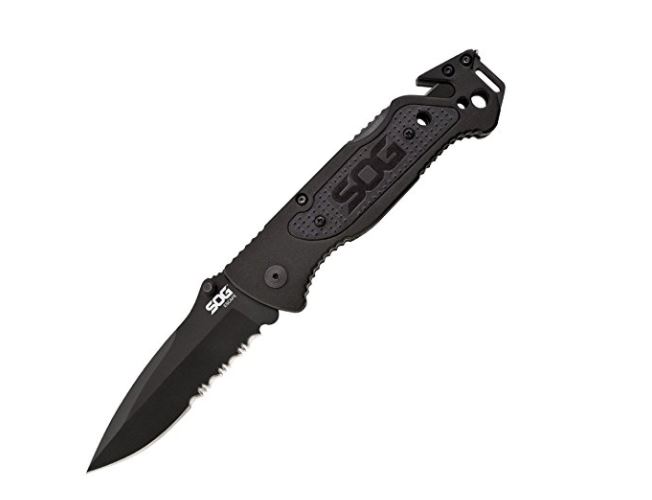 SOG Escape Folding Knife FF25-CP - Built-in Strap Cutter & Glass Breaker, Hardcased Black 3.4" Blade, Aluminum Handle