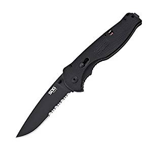 Partially Serrated, 3.5-inch AUS-8 steel folding blade has a drop point shape with a hardcase black TiNi finish