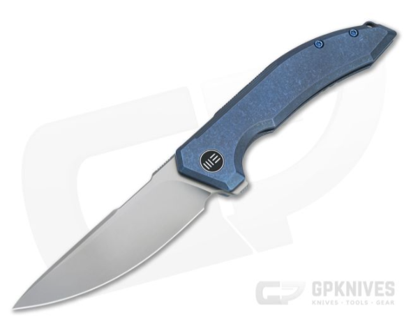 The WE Knives Quixotic is a modern titanium flipper with an industrial design. Chamfered edges on the straight spine of the blade are echoed in the handle which has fluted milling and a proud back spacer for comfort and style. This version comes with a silver bead blasted CPM-20CV blade and stonewashed blue titanium handles.