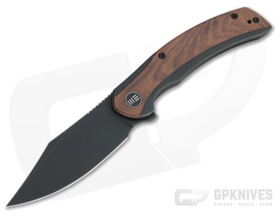 Offering high-style tactical performance, the WE Knives Snick sports a broad Bowie style clip point blade and a nested frame lock construction for a clean, modern look with a comfortable grip and top-end operation and capability. This version comes with a black stonewashed CPM-20CV blade, matching titanium handles and Cuibourtia wood inlays.