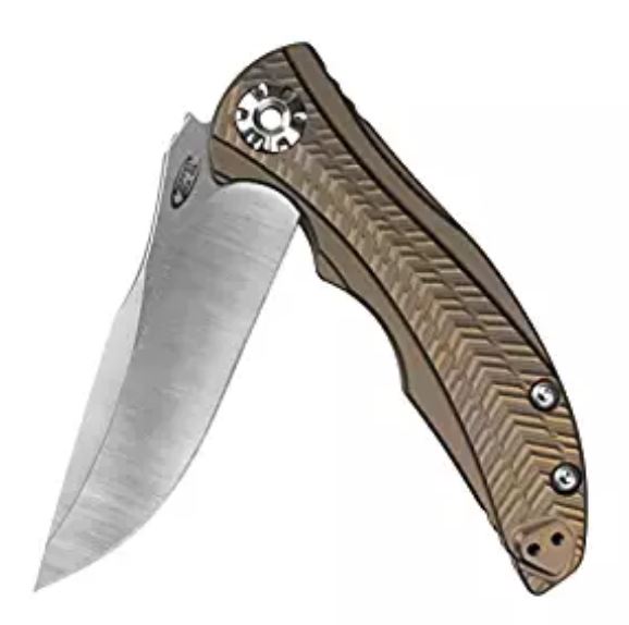 Zero Tolerance 0609 Pocketknife; 3.4-inch CPM 20CV Drop Point Blade with Two-Toned Finish; 3D Textured Titanium Handle, Anodized Bronze; KVT Ball Bearing Manual Open; Reversible Pocketclip; 3.3 oz